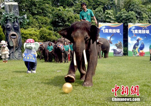 陣容最強(qiáng)大的壓軸方隊(duì)是10只大象,它們參加了運(yùn)動(dòng)會(huì)的球類項(xiàng)目,比賽現(xiàn)場擺了4個(gè)大氣球,大象向著觀眾席大腳一踢,觀眾都不自覺地當(dāng)起守門員,穩(wěn)穩(wěn)地把球接住。