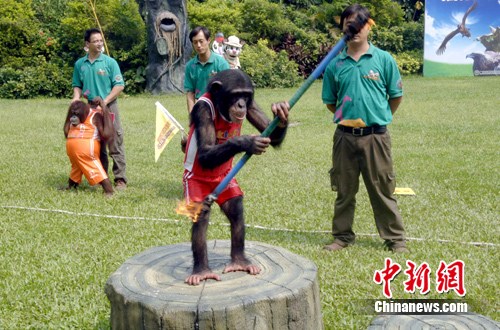 緊接著出場的是猩猩方隊(duì),5只猩猩穿上運(yùn)動(dòng)裝,精神抖擻。為了表現(xiàn)訓(xùn)練成果,他們迫不及待地點(diǎn)起熊熊火棒,觀眾看得驚險(xiǎn)萬分,可這些猩猩運(yùn)動(dòng)員卻舞得從容自在。隨后,黑猩猩跟黃猩猩還進(jìn)行了一場拔河比賽。