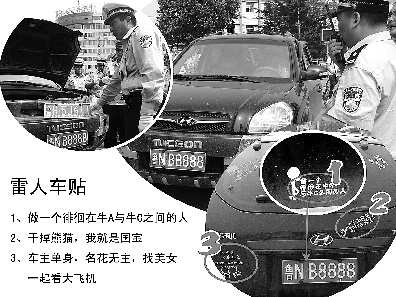更讓民警哭笑不得的是,該車車身還貼滿了諸如“干掉熊貓我就是國寶”、“做—個徘徊在牛A和牛C之間的人”、“車主單身,名花無主,找美女—起看大飛機”等雷人標語。(記者黃廣華通訊員侯明輝)