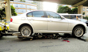 據(jù)目擊者介紹,事發(fā)時,這輛牌號為滬H的銀灰色寶馬轎車沿曲陽路由北向南行駛,至東體育會路附近時與一輛電瓶車發(fā)生碰撞。電瓶車被撞倒,騎車的中年男子當(dāng)場倒地。30多歲的女司機(jī)在慌亂中或許錯將油門當(dāng)成了剎車,轎車猛沖向前,將電瓶車一路往前推行數(shù)米遠(yuǎn)。最終,男子連人帶車被卷入轎車底盤,轎車則卡在電瓶車上,后輪騰空,車身動彈不得。