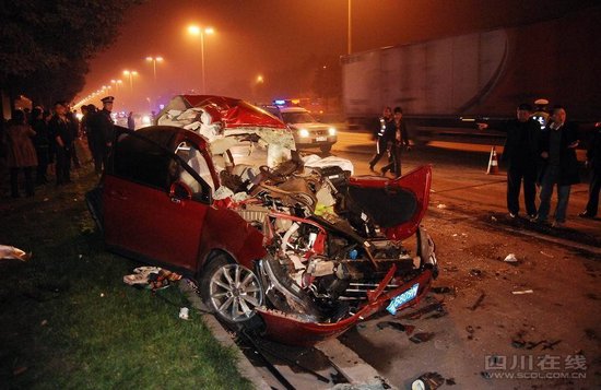 昨晚(25日)9時許,三環(huán)路南三段,一輛載了8個人的紅色世嘉與一輛大卡車發(fā)生嚴(yán)重追尾,車內(nèi)兩男一女當(dāng)場死亡,另外5人,包括兩名小孩傷勢不重,被送往市一醫(yī)院。