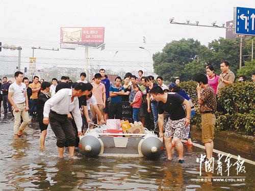老人坐在充氣的汽車內(nèi)胎、小孩坐在大塑料盆、婦女坐在木板上被推出去,男人只穿內(nèi)褲趟水的景象處處可見。各種求救信息,在網(wǎng)絡(luò)上傳播。