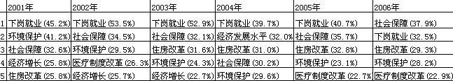 表:2001年~2006年城市居民關(guān)注的國(guó)內(nèi)社會(huì)熱點(diǎn)問題(前5位)