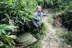 “竹子一砍掉后,一個巨大的房柱石地盤就露了出來,顏色有些發(fā)青。坍塌的坑里有很多青瓦!