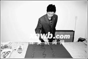 據(jù)王璽介紹,他自幼酷愛書法,2004年在西安學(xué)習(xí)期間,參加了由省政協(xié)組織的書畫活動,他見書畫名家雷長安表演的書法針筆運筆剛?cè)嵯酀?jì),結(jié)字嚴(yán)謹(jǐn)多變,布局渾然大氣,風(fēng)格酣暢灑脫,便產(chǎn)生了針書創(chuàng)作的念頭。今年,他積極摸索,利用醫(yī)療器械注射器作為工具作筆寫字,將調(diào)和的裝飾材料溶液吸到針管里,蘸到“筆尖”上,使金墨銀墨在深色宣紙上流動成為書法作品,如同毛筆在生宣紙上寫字一樣有節(jié)奏、有韻律,極具觀賞性。 (記者張松)