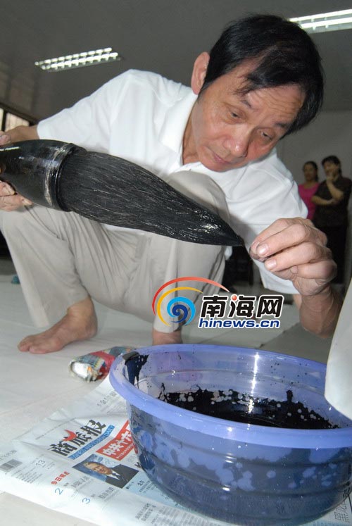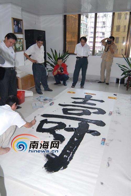 今天下午4時(shí)許,在?谑形乃嚶(lián)合會(huì)會(huì)長(zhǎng)的辦公室里,余廣老先生先先是拿出他在家里練筆的大壽字向在場(chǎng)的記者們展示。展示完后,余老先生拿出自已帶來(lái)的筆和紙。在地上鋪上一張長(zhǎng)達(dá)3.7米,寬為1.47米白紙,將白紙整平后,余老先生開(kāi)始調(diào)墨,在文聯(lián)工作人員的幫助下,余先生揮起自己帶來(lái)的大毛筆,仔細(xì)整理毛筆后,余老先生在白紙開(kāi)始揮舞,不用一會(huì)兒功夫,一個(gè)大形楷書壽字就寫成,在場(chǎng)的人給予了熱烈掌聲。(記者汪德芬)