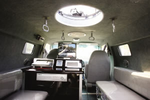 “除了功能上的特殊性,這輛車還裝備了很多高科技裝備!”張國強介紹說,除駕駛員外,這輛全封閉的車子可以搭載12名突擊隊員,但這樣一來,換氣就成了問題。所以,在該車中部天窗附近,還增設了一處特制的換氣扇,保證了車內(nèi)充足的氧氣量;其次,該車還配備了特制的逆變電源,就算是車子在停止狀態(tài),通過這種特殊的設備,12伏的電壓也能在瞬間轉變?yōu)?20伏電壓,以保證車內(nèi)電腦、監(jiān)控屏幕等電子設備正常工作。