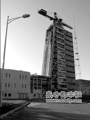 站到中心的發(fā)射塔的11層平臺上,正好可以看清對面山頂?shù)墓欧榛鹋_,據(jù)說那是楊家將的遺址。夕陽眩光中的古老烽燧,長空下線條精確的火箭發(fā)射塔,兩個時代的軍事圖騰之間,似乎注定了某種因緣。