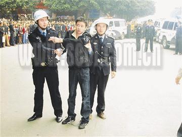 上午11時許,在雅安的兩名犯罪嫌疑人出現(xiàn)在市區(qū)西門汽車站外的路口,同行的還有4名年輕女子。當(dāng)時,幾人正在路旁等車,周圍近距離內(nèi)正好沒有行人經(jīng)過。見抓捕時機成熟,4名早已蹲守在此的便衣民警突然沖向兩名犯罪嫌疑人。兩人還沒來得及作出反應(yīng),就被民警按倒在地。回過神來后,他們拼命反抗。幾分鐘后,兩人被民警制服。