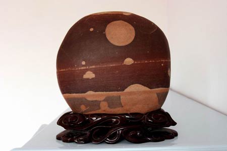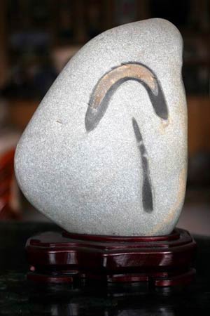 無(wú)獨(dú)有偶,當(dāng)日下午1時(shí)許,記者在西固區(qū)河口鎮(zhèn)的張先生家中也看到了一塊類似的黃河奇石,不同的是該黃河石的體形稍大,呈淡褐色,黃河石正面上部有一個(gè)直徑約4厘米的銀色滿月,滿月的左下方有一顆衛(wèi)星在做繞月飛行,而且繞月軌道清晰可見(jiàn)。張先生告訴記者,大約一年前,他從一位石友處發(fā)現(xiàn)了這塊黃河石,當(dāng)時(shí)覺(jué)得挺普通,并沒(méi)在意。最近電視、報(bào)紙連續(xù)報(bào)道“嫦娥”奔月的相關(guān)消息,他突然發(fā)現(xiàn)這塊黃河石頗似衛(wèi)星升空后繞月飛行的場(chǎng)景,便從那位石友處高價(jià)購(gòu)得。(記者 王少丹)