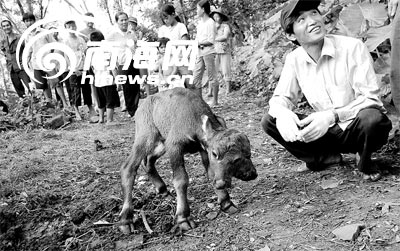 這頭牛犢是該村村民符明江家里的母牛生的。據(jù)符明江介紹:他家那只母牛是一頭水牛,已養(yǎng)了2年多時間。母牛懷孕10個月,這是它的第一胎。