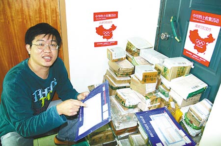 在杭州市江干區(qū)筧橋鎮(zhèn)的一間出租房里,一個叫鄭曉亮的山西小伙,正在為他的一個夢想而奮斗。他要收集全國2800多個縣級行政區(qū)域的泥土,按比例做成一張中國地圖,在上面插滿奧運(yùn)圣火,然后把這個特殊的禮物獻(xiàn)給2008北京奧運(yùn)會。
