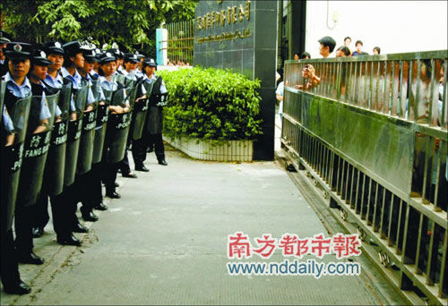 “工人把107國道堵了!”昨日下午2時許,司機(jī)劉先生給本報打來電話,說在寶安西鄉(xiāng)107國道南太天橋自寶安往關(guān)內(nèi)方向被多名工人封堵。造成寶安方向交通堵塞,車輛大排長龍。記者下午3時許到達(dá)現(xiàn)場時,堵路情況已經(jīng)緩解,工人們在街道辦和勞動部門勸解下逐漸回到廠內(nèi)。在位于西鄉(xiāng)南太路的華洋公司門外,多名警察身攜防暴裝備嚴(yán)陣以待,防止暴力事件的發(fā)生。另有幾十名巡防隊員、保安守在門口。