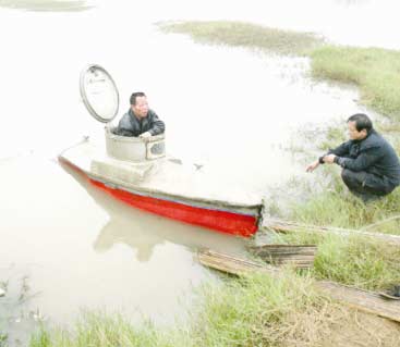下午4時,試水開始。李玉明鉆進潛艇,關(guān)上頂蓋。在卡車的牽引下,整個潛艇被拖行近10米。在2米多深的水下潛行10秒后,潛艇重新浮出水面。岸上的工作人員擊掌相慶,隨即引燃鞭炮,宣布試航成功。