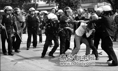 野雞車被查后逃竄,運政稽查車被砸并遭圍攻,盾牌晃動、鋼盔閃亮……昨天上午9時45分,廣州市交通運輸管理局運政稽查一大隊十余名工作人員在蘿崗區(qū)宏明路口查處“野雞車”時,遭到暴力抗法并被20多名湖南籍男女圍困近3小時。警方在三次勸說無效后于中午12時出動100多名警力將這些男女強行帶離。