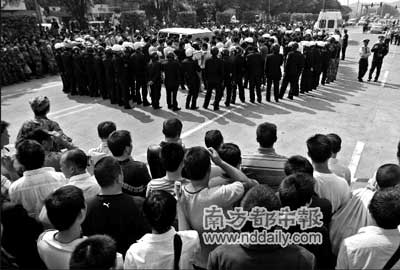 現(xiàn)場一片緊張的氣氛。20多名男女聚集在蘿崗區(qū)宏明路16號門口,面紅耳赤地吼叫著。他們旁邊是一輛保險杠和雨刮都不知去向的面包車,窗前支著一塊“運政稽查”紅色牌子;他們身旁是由特警、民警、輔警和治安隊員百余人組成的一道封鎖線和約250平方米的封鎖區(qū),封鎖線旁則是數(shù)百圍觀的群眾。