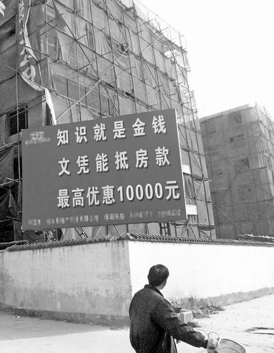 數(shù)十平方米的3塊巨大廣告牌,位于漯河市嵩山路南段與湘江路西段交叉口,緊鄰的是一幢幢正在拔地而起的住宅樓。記者看到,廣告牌上寫著“知識(shí)就是金錢、文憑能抵房款、最高優(yōu)惠10000元”等字樣(如圖)。這一做法,引發(fā)眾多圍觀者的熱議。