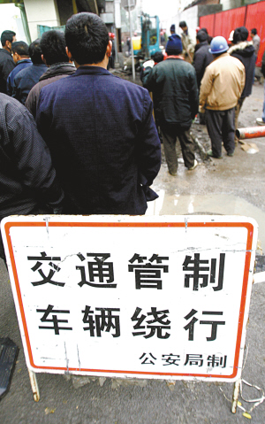 路邊塌陷現(xiàn)場,前日的大坑面積已進一步擴大,深度超過2米。來自市自來水公司、北京市公用設施搶險大隊的工人和網(wǎng)通20多名工作人員,一邊研究地下的結構和線路,一邊進行搶修。