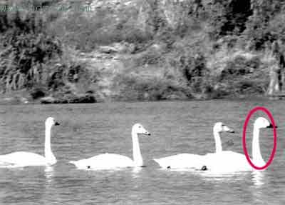 11月10日上午,她的妹夫從上海打電話給她,說(shuō)起村里溪面上出現(xiàn)會(huì)飛的“鵝”的事,感到奇怪。蔡麗軍當(dāng)時(shí)就想這可能是白天鵝,但福鼎此前從沒(méi)有出現(xiàn)過(guò)白天鵝,她也不敢肯定,就提了攝像機(jī)騎著摩托車(chē)趕到水北溪洪水沖毀的斷橋處,果然看到了4只翩翩起舞的“鵝”,和電視書(shū)本上看到的白天鵝一樣。她非常激動(dòng),沿著溪岸一路追蹤。當(dāng)時(shí)這4只白天鵝在方圓一公里的范圍內(nèi)活動(dòng),她追蹤拍攝持續(xù)到當(dāng)天下午3時(shí)多。