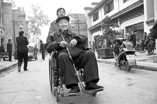 “盧爹,今天大盤怎么樣?”當(dāng)老人結(jié)束一天的看盤,由他的保姆推著輪椅回到太平街時,一路上都有人不斷地笑著向他詢問,而他只是呵呵笑著點頭示意。(記者龔磊文/圖)