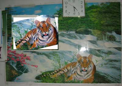 昨天晚上九時許,網(wǎng)友“攀枝花xydz”在“打虎派”的大本營色影無忌華南虎臨時論壇里發(fā)帖稱:“老虎是假的。我今天仔細(xì)看我家的一副掛在墻上的老虎畫,除了耳朵不一樣,哪里都是一樣的,連老虎的紋路都是一樣的。但我不知道怎么傳圖,我已經(jīng)照下來了。”今天上午10點半,網(wǎng)友小魚啵啵啵將他收到的圖片發(fā)到了同一論壇,《人肉引擎搜索結(jié)果,請看四川攀枝花朋友給我發(fā)的疑似老虎原圖》。這張照片剛一出來,到中午就已被頂?shù)搅?3頁。各路高手更是立即將年畫老虎與“周老虎”進(jìn)行了比對,得出是同一只老虎的結(jié)論。打虎陣營一片歡呼。