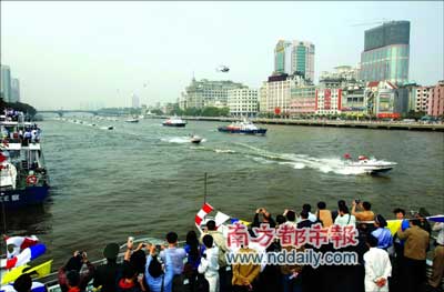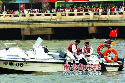 疑犯開著快艇一路狂逃,半路將人質(zhì)踹入水中;警方救人、擒賊、打撈物證,十幾分鐘內(nèi)全部完成。昨天,走過百余年歷史、默默守護(hù)珠江的廣州水警由幕后走向前臺(tái)!鞍倌晁,再創(chuàng)輝煌”2007年廣州警察開放日活動(dòng)在濱江西路水警碼頭和人民橋至解放大橋之間的珠江河面舉行。廣州水警向萬(wàn)名圍觀市民演示了水上反劫持抓捕行動(dòng)。這是第六屆廣州“警察開放日”活動(dòng)的重頭戲。此外,水上表演還包含消防船表演、飛行表演等多個(gè)項(xiàng)目。