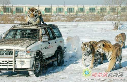 這時,馴養(yǎng)員的投食車駛?cè)雸@內(nèi),老虎知道要開飯了,迅速圍攏過來。隨著一次次撲躍,一只只活雞被老虎叼到嘴里,一只心急的老虎縱身跳到車上,隔著鐵絲網(wǎng)守著投食的天窗不肯離開,直到馴養(yǎng)員伸出木棍驅(qū)趕,它才悻悻離去。