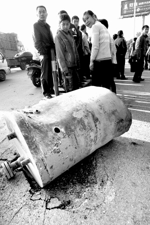 從楊高南路看進(jìn)去,加油站里面三座加油機(jī)尚且完好。而最靠浦三路的一臺(tái)平時(shí)為助動(dòng)車加氣的加氣裝置已經(jīng)面目全非,底面積約四十平方米的地下貯氣罐被炸出地面。東側(cè)的楊高南路,西側(cè)的浦三路,包括更遠(yuǎn)處的昌里東路上,散落著大大小小的碎石,一個(gè)直徑半米左右的鐵罐,將楊高南路的非機(jī)動(dòng)車道砸出了一個(gè)洞。