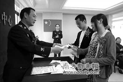 在得知女友懷上了孖仔后,為了給即將出生的兩個寶寶一個合法的身份,中山市看守所內(nèi)的服刑人員袁某提出要與女友結婚?词厮L證婚,婚禮現(xiàn)場的布置由看守所的民警一手張羅。11月21日,袁某與女友如愿在中山市婚姻登記中心登記成為合法夫妻,成為中山市首個登記結婚的服刑人員。