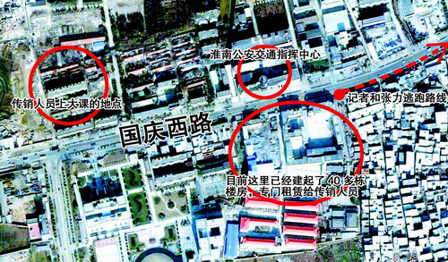 張力簡單地介紹了情況:一個龐大的非法傳銷組織,此地大約40棟房屋內(nèi)租住有近5000人,打著“天津天獅生物發(fā)展公司”的旗號,推銷的是一種賺錢的方法,新人入會交納2800元,采用非法傳銷通用的五級晉升制度。新人剛來無論干什么都會有人陪同,寸步不離,包括上廁所和洗澡。