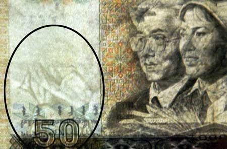 后經(jīng)記者仔細(xì)辨認(rèn),發(fā)現(xiàn)這張編號為GS8790902的1990年版的50元人民幣和其他同版本同面值的一樣,正面都是工人、農(nóng)民和知識分子頭像,背面是黃河的壺口瀑布,不同的是正面毛主席像水印頭像卻呈倒立狀,并且位置比正常錢幣偏上。這張錢幣的水印和正常錢幣的差異如此之大,難道是張假幣?可是朱燦祥卻告訴記者,他的這張鈔票無論在哪家銀行驗鈔,都會出現(xiàn)同一個結(jié)果:是張真幣。