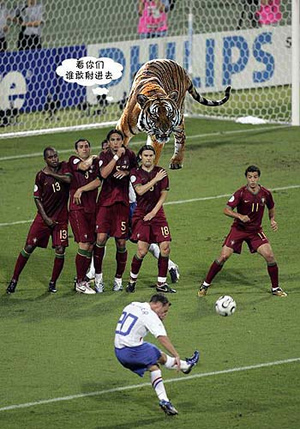 一些網(wǎng)友還為華南虎賦予“靈性”,讓它參與了激烈的足球賽,甚至做起了“門衛(wèi)”。在球賽版的PS照片中,華南虎成為了守門員,正“虎視眈眈”地盯著“對(duì)手”,甚至還威脅“看你們誰敢射進(jìn)門”(網(wǎng)友設(shè)計(jì)臺(tái)詞),那場(chǎng)景讓人忍俊不禁。