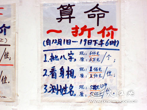 4日,按照熊先生提供的線索,記者在湯家園巷82號找到了這家自稱是“心靈垂詢室”小房子.房子大門緊閉并掛有一“大降價”的牌子,門的一側是“好消息”.屋主自稱李師祖,12月份是他的生日,所以他舉行了這次“一折價活動”;另一側墻面貼滿了諸如“算命一折價”、“風水一折價”等小紙片。記者查看了所有的紙片,“原價”最高的為6萬元,“一折價”后6千元。