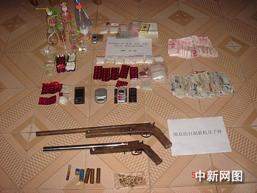 中新網(wǎng)韶關(guān)12月7日電(馮昶 陳文明 張黛虹)廣東韶關(guān)樂昌市警方今天稱,警方在日前開展的代號為“搜狐”的緝毒行動中,成功抓獲了販毒犯罪嫌疑人6名,當(dāng)場繳獲自制獵槍2支,子彈4發(fā),搖頭丸、冰毒等一大批毒品,以及毒資人民幣5000多元。至此,一個在樂昌市區(qū)娛樂場所販賣毒品的特大涉槍販毒團(tuán)伙被警方成功摧毀。