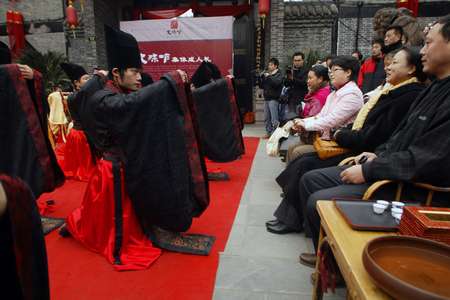 孩子什么時候才算是長大成人了?對現(xiàn)代人來說,“長大”是個相對模糊的概念,因而對承擔起家庭和社會的責任也沒有一個相對準確的時間概念。然而在清代以前,我國的漢族文化中就有一個準確的界定,女孩長到15歲、男孩長到20歲就要行成人禮。昨天上午,在文殊坊,這種已經消失300余年的漢族成人禮被我市熱衷于漢文化的市民再度拾起,20個15歲到20歲的年輕男女在這里隆重地舉行了他們的成人禮。對許多人來說,這次成人禮似乎更像一種游戲,但參與者卻認為,這次成人禮將改變他們的人生態(tài)度。