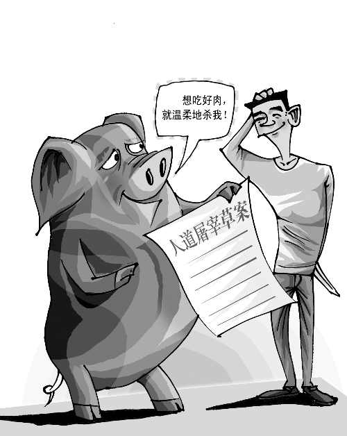 趕豬的時候,要拿著塑料拍輕輕地拍豬屁股,哄著它往前走;在上“斷頭臺”的途中,還要看到自己的伙伴,這樣才能讓待宰的豬沒有恐懼感……這些僅僅是正在制定的人道屠宰規(guī)定的一小部分。