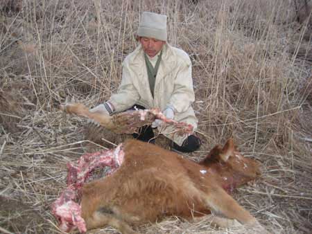 15日早,村民王立舉上山撿柴,發(fā)現(xiàn)了一大一小兩只老虎的蹄印。而一60歲村民說(shuō),他兩天前在山里打柴時(shí)親眼看到山腳下有一大一小兩只老虎。15日上午9時(shí),祖、樸兩家共4人出去找失蹤的牛。11時(shí)許,4人在距寧幾何家死牛處300米的葦塘發(fā)現(xiàn)了祖秉禮家兩天前失蹤的一頭兩歲母牛,后臀已被吃掉了。他們怕老虎就在附近,于是就趕緊各自回家。
