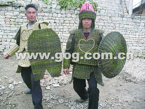 近日,被蜀國(guó)丞相諸葛亮用火燒死的藤甲兵在安順“復(fù)活”(如圖)。記者昨日在安順開(kāi)發(fā)區(qū)歪寨村看見(jiàn),該村村民根據(jù)老人的回憶復(fù)制的兩副藤甲已經(jīng)全部完成,村民穿在身上,活像三國(guó)時(shí)期曾大敗蜀軍的“藤甲兵”,令人驚奇不已。