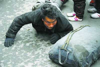 今年4月份他到洛陽(yáng)一建筑工地打工,后來包工頭跑了,他4000多元血汗錢沒了影兒,回家的車票都買不起。后來他被救助站輾轉(zhuǎn)送到鄭州。腰是被凍壞的,現(xiàn)在站直腰板會(huì)很疼。至于在鄭州的馬路上爬行目的何在?范曹鎮(zhèn)解釋說:“興許能碰上到安徽的長(zhǎng)途車,然后跟司機(jī)商量,先回到安徽再給車錢。”