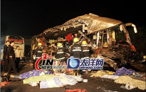 記者凌晨在車禍現(xiàn)場看到,交警、消防等部門正在緊張地進(jìn)行救援。事故現(xiàn)場慘不忍睹,事故點(diǎn)外圍數(shù)十米范圍內(nèi)都可見碎玻璃和車體零件等雜物,臥鋪車上的床單亦四處可見。高速路中間一段近十米的綠化帶幾乎被完全壓平。從貴陽開往珠海的臥鋪大客車(粵C50821)右側(cè)大部分變形,另一輛從深圳開往南寧的臥鋪大客車(桂A18716)右側(cè)損壞更為嚴(yán)重,基本上不見整個(gè)右側(cè)車體。