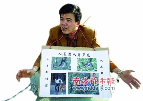“兄弟,你這是干啥呀?”昨天下午4點(diǎn)半左右,4名男子圍上來奇怪的打量著包先生。聽說他們都不知道“華南虎事件”,包先生眉毛一揚(yáng),一字一頓地講開了:“周正龍是陜西打獵的農(nóng)民,拍了華南虎的照片;我是廣東放牛的農(nóng)民,現(xiàn)在出來打老虎!