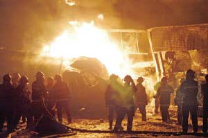 昨晚9點30分左右,一輛油罐車在順義區(qū)李橋鎮(zhèn)后橋村一加油站附近碰撞一輛集裝箱貨車。事故引發(fā)一場大火、多次爆炸。順義區(qū)6個消防隊參與滅火,至昨晚11點45分,大火被撲滅。油罐車中一人喪生,警方緊急疏散附近百余名村民。