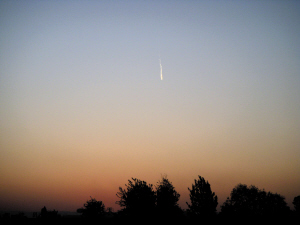 網(wǎng)友“20231”在帖子中回憶:他家住在離機場不遠的地方,昨天早上7點40分,他打開窗簾,朝正東方向機場上空看去,突然看到空中有一個發(fā)亮的不明物體。由于距離遠,看不出不明物體是否在移動。它一直停留在空中,顏色逐漸變淡。用相機拍下來后大約過了5分鐘,物體消失了。從照片上看,它拖著一根長尾巴,被朝陽照得發(fā)亮,但看不清頭部是什么模樣。