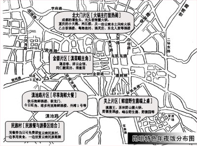 在金碧路繁華商業(yè)街區(qū),滇味在這里大唱主角。藹若春、祥云會(huì)館、同仁靚菜坊、得意居均主打滇味菜肴。部分餐館不僅有老昆明的庭院式古樓,還配以豐富的綠色植物營(yíng)造景觀。10人桌標(biāo)準(zhǔn)為500元-1000元,人均消費(fèi)50元-100元。