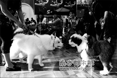 現(xiàn)場一下子要請來幾十名狗狗,真不容易。狗主們各顯神通,有的拿包包當工具,有的直接抱進來的,訓(xùn)練有素的狗狗則直接跟在主人后面閃亮登場了。它們在現(xiàn)場看到這么多同類,都好奇地互相打量,小心翼翼地上前用鼻子嗅嗅,算是問個安了。