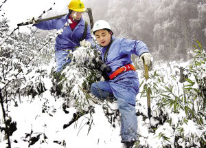 渝東南連續(xù)3日普降大雪,武隆仙女山等地積雪超過10厘米,部分電力設(shè)施出現(xiàn)覆冰現(xiàn)象。一旦冰塊增多,輸電線的電阻增加減少輸電能力,電線還容易下垂斷裂。一旦斷裂,不僅這些區(qū)縣將出現(xiàn)大面積停電,進(jìn)出主城的電力也會受到影響。為了保證電力的正常供應(yīng),一支24人的“打冰隊(duì)”每天都在巡查打冰。