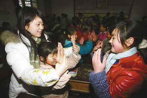 晚6時,東洲春蕾希望小學(xué)。住校的孩子們都已吃過晚飯,但停了一天的電依然沒來。一陣哨子聲響過,同學(xué)們又回到教室。一年級2班,數(shù)學(xué)老師姚川杰正和孩子們做游戲,教大家拍手和跺腳取暖。“如果感到快樂你就拍拍手!”跟著老師的節(jié)奏,孩子們的巴掌聲響成一片。