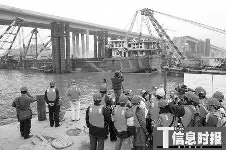 據(jù)悉,橋體拆除工作的第一階段工作包括穩(wěn)定墩、支架墩、牽制墩、臨時墩及牽引穩(wěn)定體系等。記者昨天現(xiàn)場看到,第一階段穩(wěn)定墩、支架墩的全部施工工作已完成,主牽引墩、1#、2#、3#牽制墩,1#、2#、3#臨時墩的承臺也全部完成,1#、2#、3#臨時墩鋼橫梁也均已至位,即將安裝到位。切割船體移開后,坍塌斜梁將會通過牽引系牽制穩(wěn)定,分塊切除清理,“除了斜梁段將會被切斷拆除外,緊接斜梁的橋身也要被切除一部分,長度大約為88米,這項(xiàng)工作我們力爭用兩個月時間清理完善!