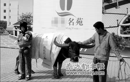 昨日中午12時(shí)許,一頭盛裝打扮的大水牛站在一輛貨車上,沿珠海斗門城區(qū)和新青工業(yè)園一路游行。笨拙的水牛也能成為大明星?新年伊始,不甘寂寞的珠海地產(chǎn)富豪賈永清又有新動(dòng)作,自稱為了活躍目前相對低迷的房地產(chǎn)市場,以每天300元的價(jià)格從當(dāng)?shù)剞r(nóng)戶家找來一頭大水牛,為自己的樓盤做起形象代言,并在牛身上披紅掛彩,敲鑼打鼓沿街游走,向路人拜年。