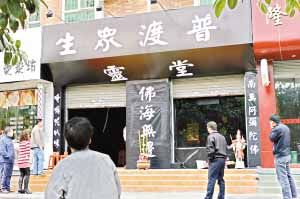 白云區(qū)景泰街隆康社區(qū)居委會(huì)的劉主任說(shuō),該店面此前也是做餐飲的,后來(lái)由于樓上住戶的投訴,被有關(guān)部門聯(lián)合取締了。現(xiàn)在的餐館雖取得了營(yíng)業(yè)執(zhí)照,也是因?yàn)樽魮?dān)心消防問(wèn)題去投訴而做不下去。居委會(huì)接到住戶的投訴后,就去做工作!拔覀兘(jīng)過(guò)努力,說(shuō)服了店主,今天下午那兩個(gè)工人就把靈堂撤掉了,事情也就解決了!